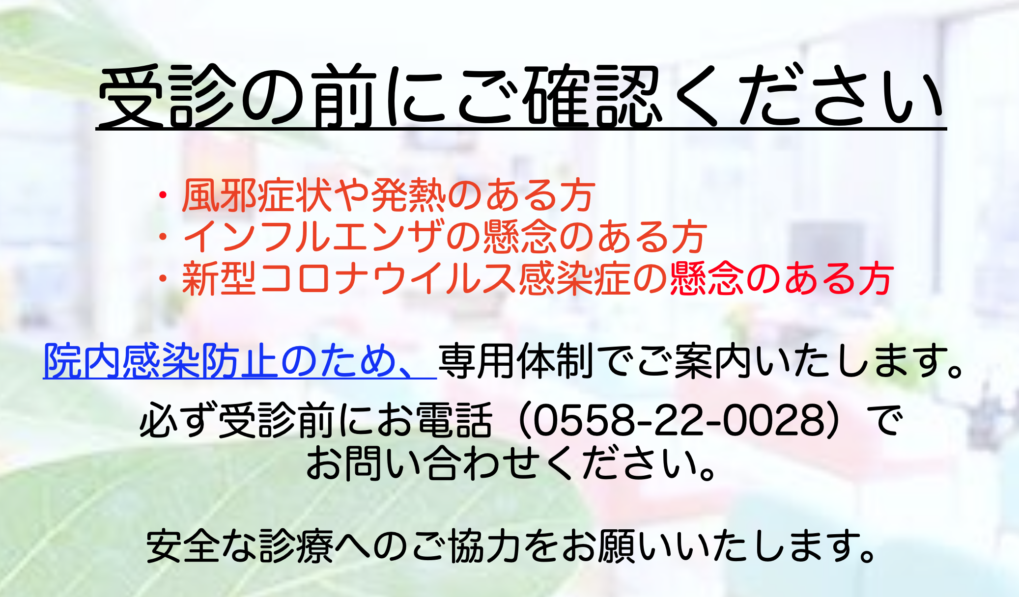 必ず受診前にお電話(0558-22-0028)でお問い合わせください。